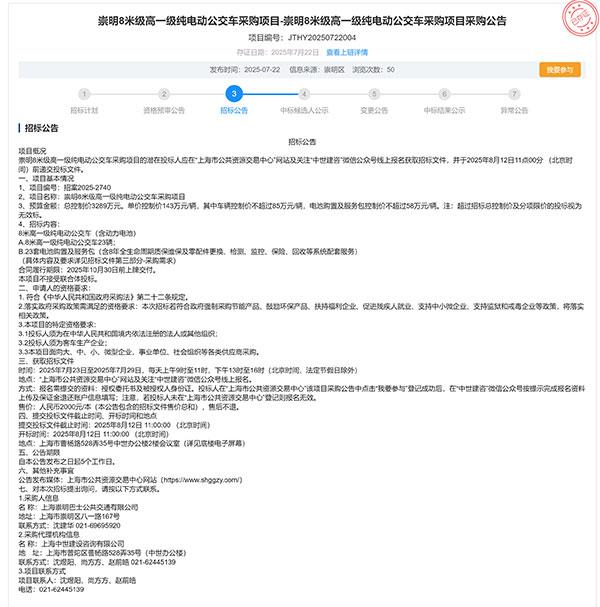 2025年7月22日,上海崇明巴士公共交通有限公司通过上海市公共资源交易中心,发布了2025年新能源城市公交车采购招标公告,拟投入采购预算资金17037万元,批量集中采购新能源城市公交车118辆。